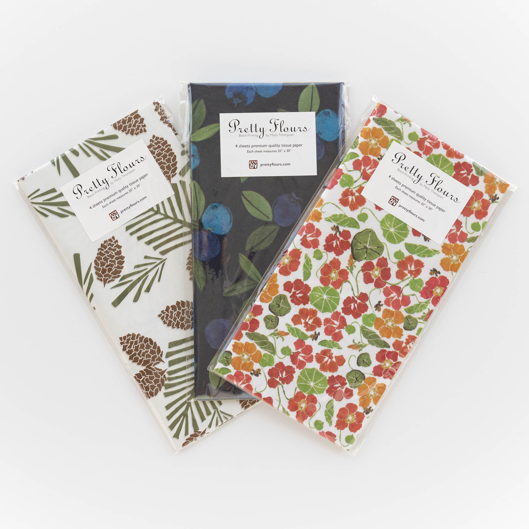 Tissue Paper is printed from the original Pine & Cone block print design by Molly Thompson. Generously sized, each sheet of tissue paper measures 20″ X 30″. Printed on eco-friendly (compostable or recyclable) premium-quality tissue and packaged in a clear cellophane sleeve. Four sheets per package.